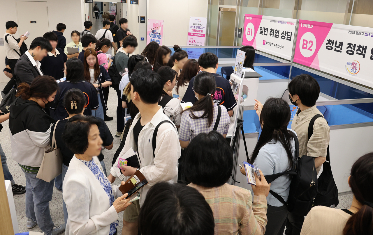 | 지난달 27일 오후 부산 동래구청 2층 동백홀에서 열린 ‘2025년 동래구 청년 공공기관 채용박람회’ 일반취업 상담 창구에 구직자들로 붐비고 있다. [연합] |