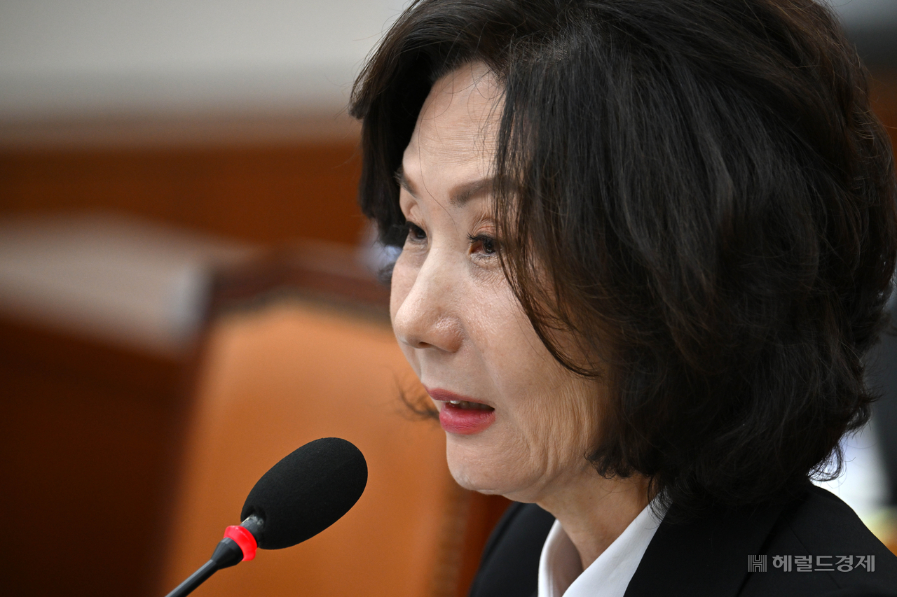 | 이진숙 교육부 장관 후보자가 16일 오후 서울 여의도 국회 교육위원회에서 열린 인사청문회에 참석해 의원들의 질의에 답변하고 있다. 임세준 기자 |