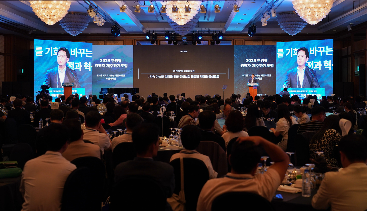 이재상 대표는 16일 제주 서귀포시 롯데호텔에서 개막한 ‘2025년 한경협 경영자 제주하계포럼’ 첫 날 ‘K팝의 위기와 도전 : 지속가능한 성장을 위한 하이브의 글로벌 확장을 중심으로’라는 주제로 기조강연을 가졌다.
