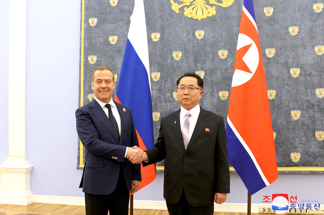 | 리히용 북한 당 비서(오른쪽)가 지난 26일 러시아 드미트리 메드베데프 국가안보회의 부의장을 만났다고 조선중앙통신이 28일 보도했다. 자료사진. [연합] |