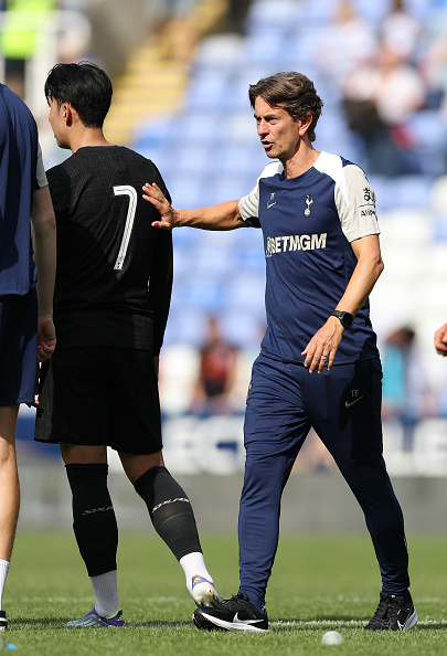 | 토마스 프랑크 토트넘 신임 감독이 레딩과 프리 시즌 경기서 손흥민의 등을 다독이는 모습 [게티이미지] |