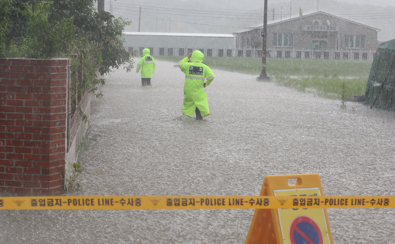 | 17일 오후 경남 창녕군 도천면 송진2구 마을에서 경찰이 마을 순찰을 하고 있다. 창녕군은 이날 0시부터 오후 3시55분 기준 도천지점 강수량이 272㎜에 달하자 인근 마을회관으로 대피해달라고 재난 문자를 발송했다. [연합] |