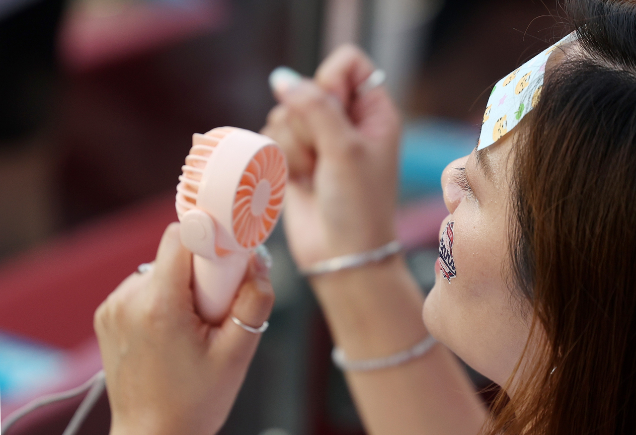 | 2025 KBO리그 경기에서 한 팬이 휴대용 선풍기를 들고 응원하고 있다. [뉴시스] |