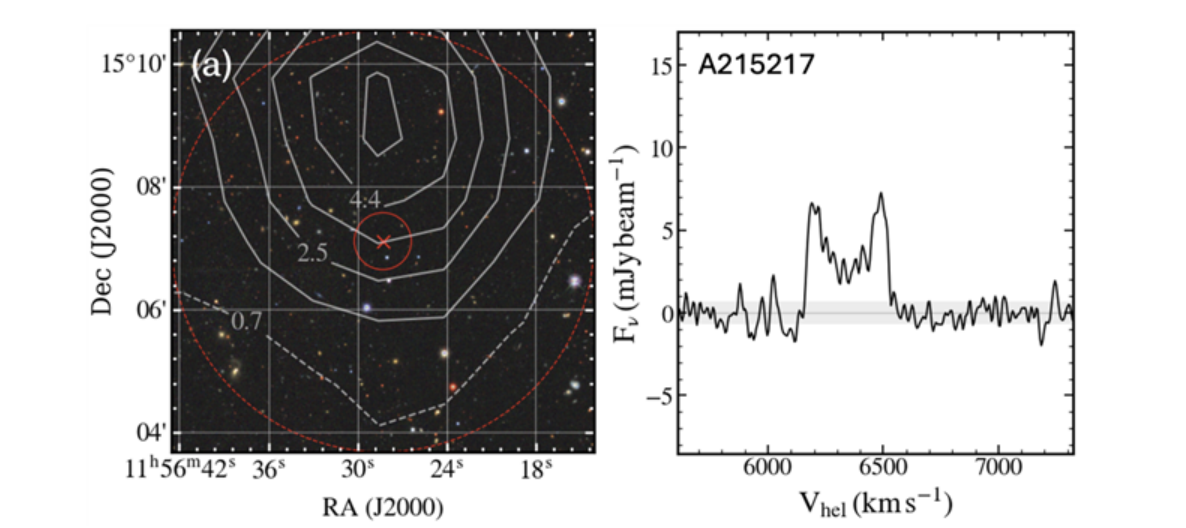 | 암흑 은하 후보 A215217의 예. (왼쪽) 가시광 컬러 영상 위에 HI 중성수소 분포를 등고선으로 표시 (등고선의 숫자는 1019cm-2 단위의 중성수소 기둥 밀도를 의미). 중심에 빨간색 가위표는 은하의 중심을 의미하고, 빨간색 두 동그라미는 각각 은하 위치 불확실도의 중앙값과 5를 의미한다. (오른쪽) 중성수소 관측에서 얻은 스펙트럼. 중심에 두 개의 봉우리가 자체 중력으로 회전하고 있는 은하와 비슷한 천체임을 암시한다. [서울대학교 제공] |