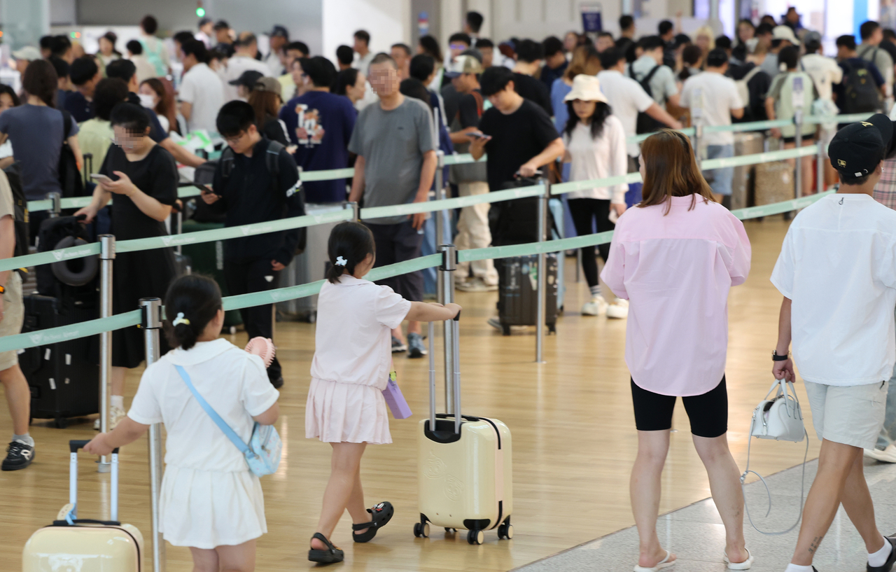 | 여름 휴가철인 16일 인천 영종도 인천국제공항 1터미널이 탑승객들로 붐비고 있다. [연합] |