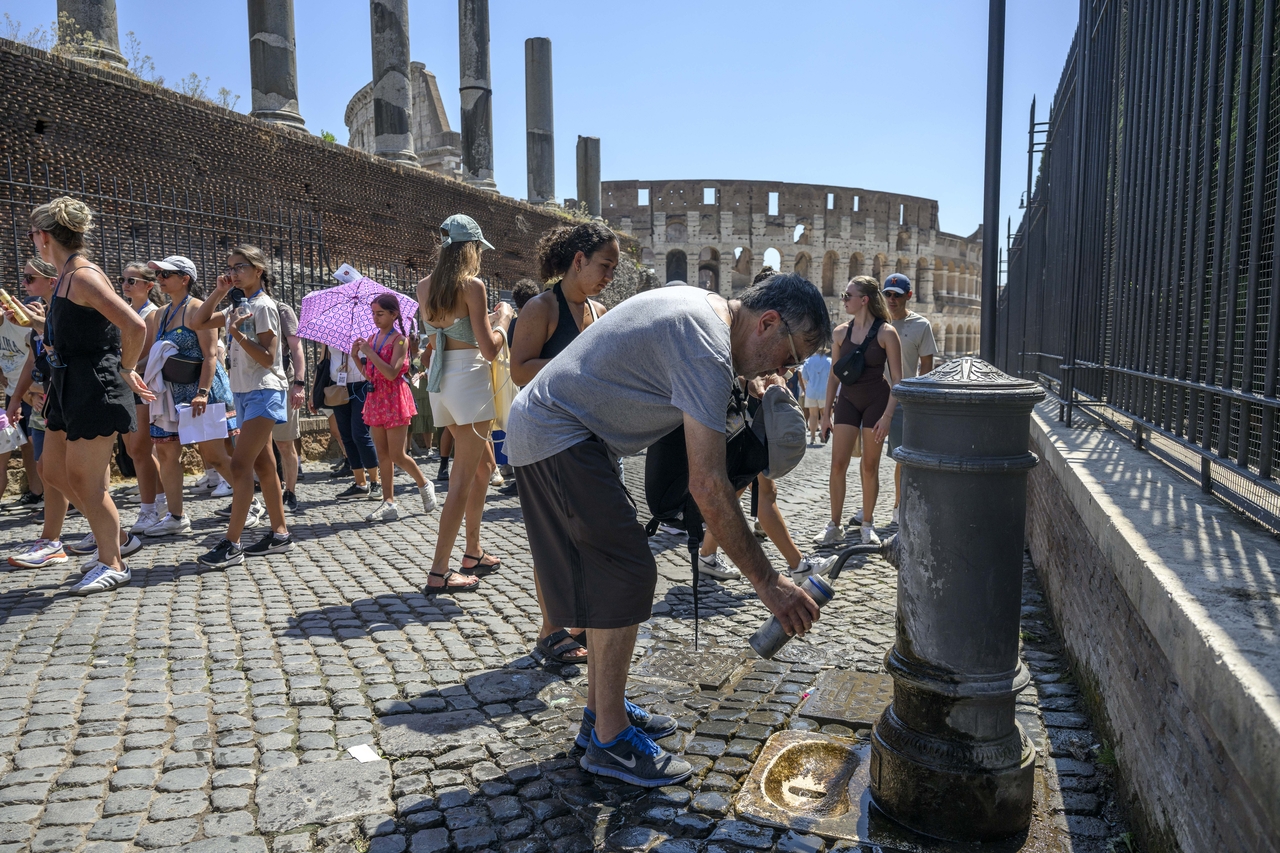 | 지난 1일(현지시간) 이탈리아 로마의 콜로세움 근처에서 기온이 40도에 달하는 폭염이 계속되는 가운데 한 관광객이 물을 받고 있다. [게티이미지] |