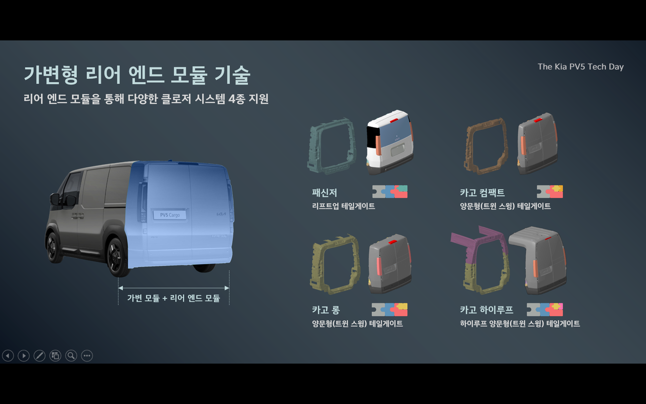 우선 기본 바디만해도 ▷패신저(롱) ▷카고 롱(3도어/4도어)을 비롯해 ▷카고 컴팩트(3도어/4도어) ▷카고 하이루프(3도어/4도어)까지 총 7종에 달한다. 또한 PV5는 전면부와 1열 구조를 전 모델에 공통 적용하고 1열 이후 구조는 리어 오버행, 테일게이트, 쿼터 글라스 등을 모듈 단위로 구성해 최대 16종의 바디를 유연하게 조합할 수 있다.