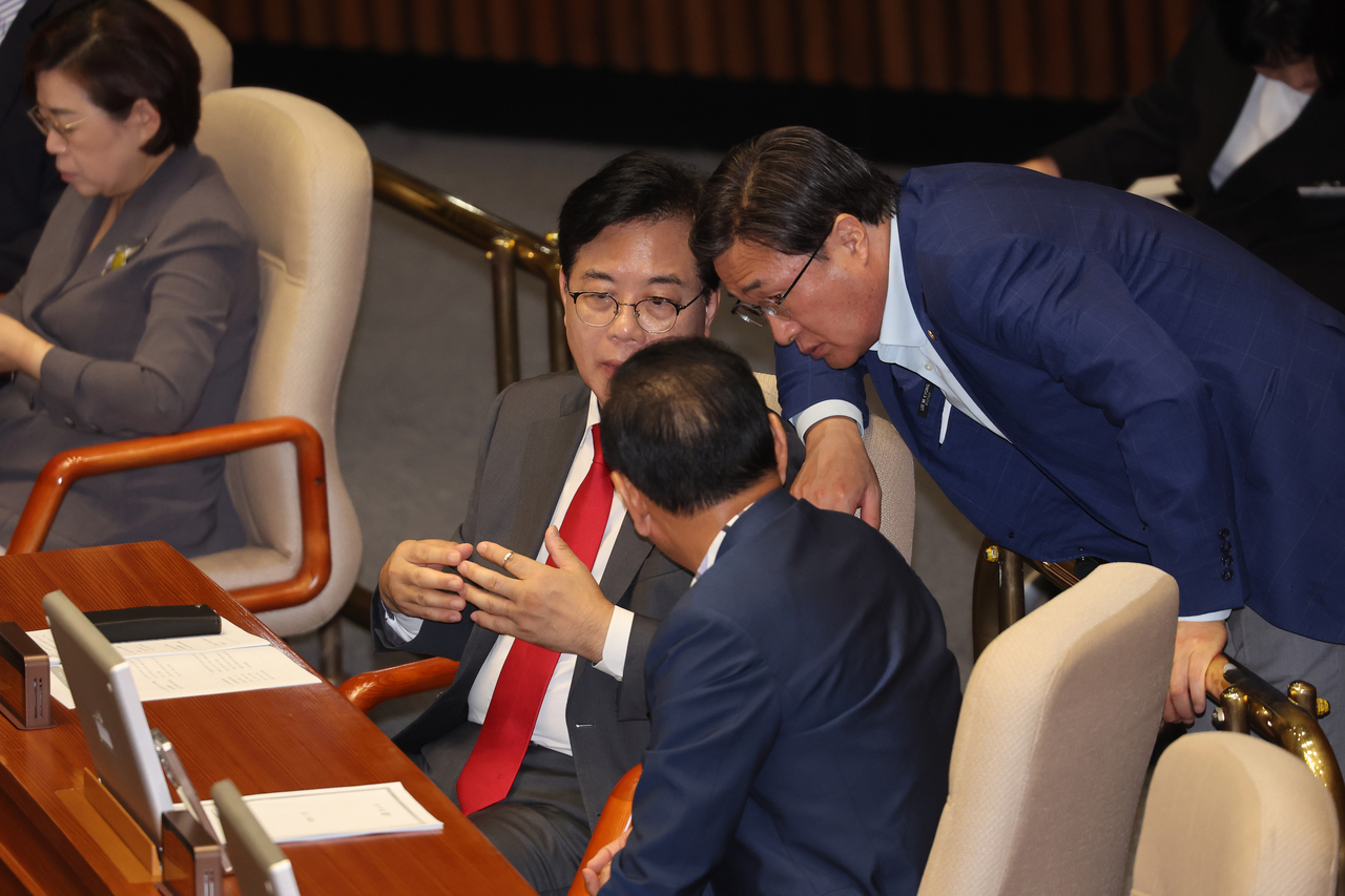 | 송언석 국민의힘 비상대책위원장 겸 원내대표가 23일 국회 본회의에서 박덕흠 의원, 김대식 의원과 대화하고 있다. [연합] |