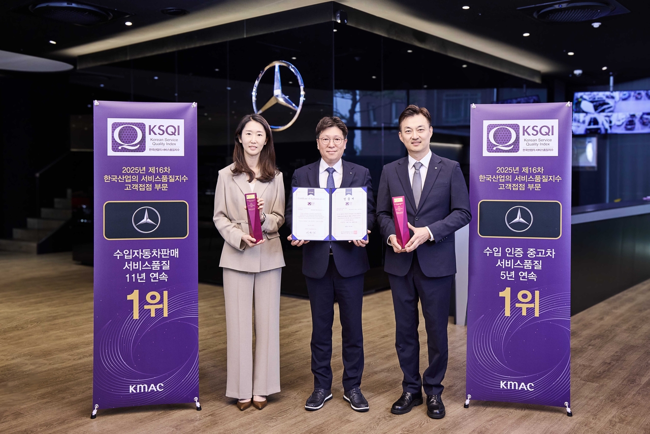 [헤럴드경제=양대근 기자] 메르세데스-벤츠 코리아가 한국능률협회컨설팅 주관 고객 접점 조사 ‘2025 한국산업의 서비스품질지수(KSQI)’에서 11년 연속 ‘수입자동차판매점’ 부문 1위를 기록했다. 이와 함께 5년 연속 ‘수입인증중고차’ 부문 1위를 차지했다