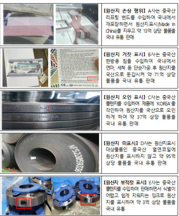 아울러 철강협회 등 유관기관 정보, 국민 제보를 활용해 67개 업체를 단속 대상으로 최종 선별·점검했으며 그 결과 ▷원산지 미표시, ▷원산지표시 손상, ▷원산지 거짓 표시, ▷원산지 오인 표시 행위 등 다양한 위반행위를 적발했다.