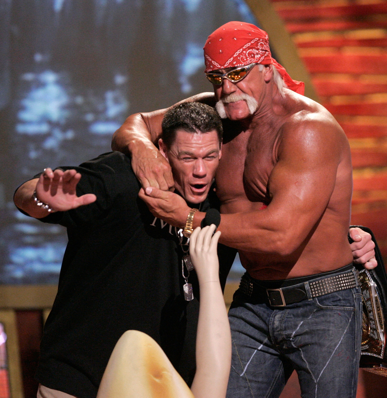 | 프로레슬링계의 전설 헐크 호건(오른쪽)이 지난 2005년 8월 14일 캘리포니아 유니버설 시티 깁슨 원형극장에서 열린 2005 틴 초이스 어워드에서 레슬매니아 챔피언 존 시나의 목을 팔로 감싸고 있다. [로이터] |