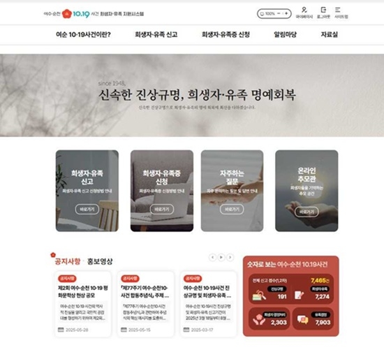 특히 여순사건 희생자 유족을 위한 지원사이트인 ‘희생자 유족지원시스템’과 ‘전남도 공간정보 참여마당’ 사이트를 한 곳에 모아 관련 정보 검색과 역사 유적지 현황 등도 한눈에 볼 수 있다.
