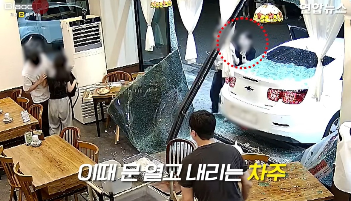 27일 연합뉴스TV에 따르면 지난 11일 인천시 청라동의 한 식당 앞에서 승용차가 갑자기 후진 가속하며 유리창을 들이받고 내부로 진입했다.
