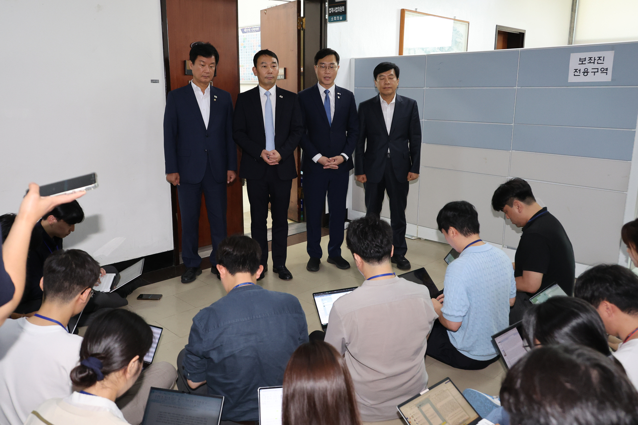 | 28일 국회 법제사법위원회 법안심사제1소위원회에서 집중투표제를 의무화하고 감사위원 분리 선출을 확대하는 내용의 상법 개정안을 여당 주도로 통과시킨 더불어민주당 소속 의원들이 취재진에게 내용을 설명하고 있다. [연합] |