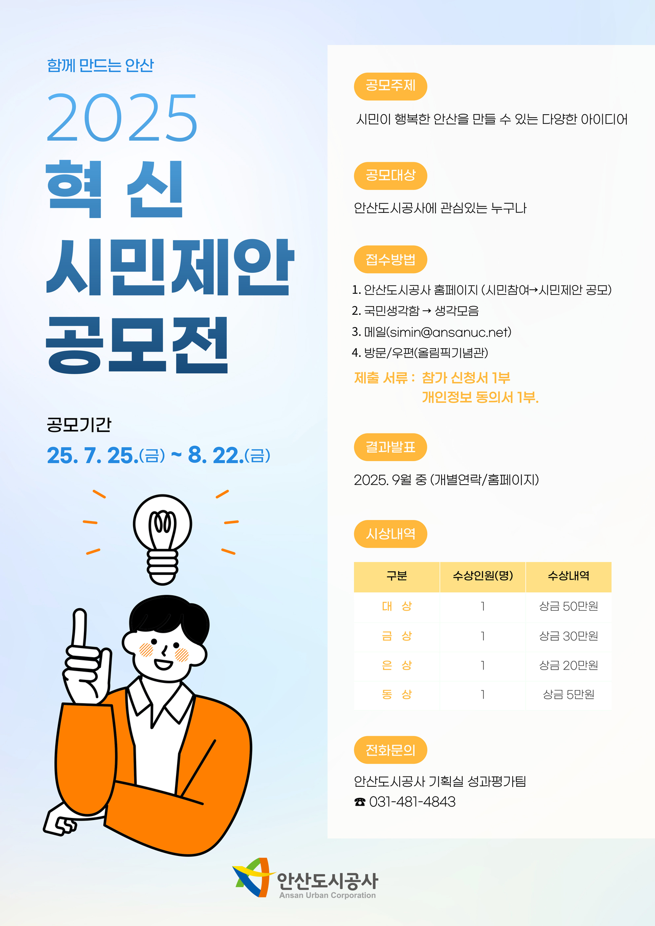 이번 공모는 안산도시공사에 관심 있는 국민 누구나 참여할 수 있으며, 시민 중심 경영 실현을 위한 참여형 제안 프로그램으로 마련됐다.