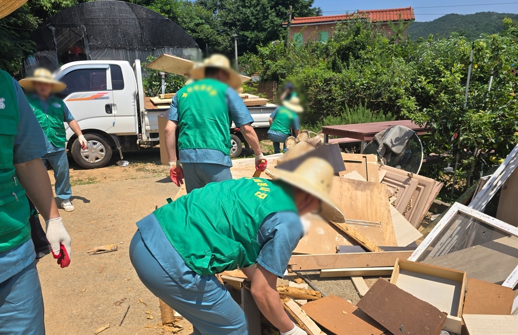 봉사단은 침수 주택 토사물 제거와 가재도구 정리, 비닐하우스 복구 작업뿐 아니라 노후 배수시설 점검 등 수해 예방 작업에도 참여하고 있다. 다만 여름기온을 감안해 체감온도 33도 이상시 1시간당 15~20분 휴식 수칙을 지키고 있다.