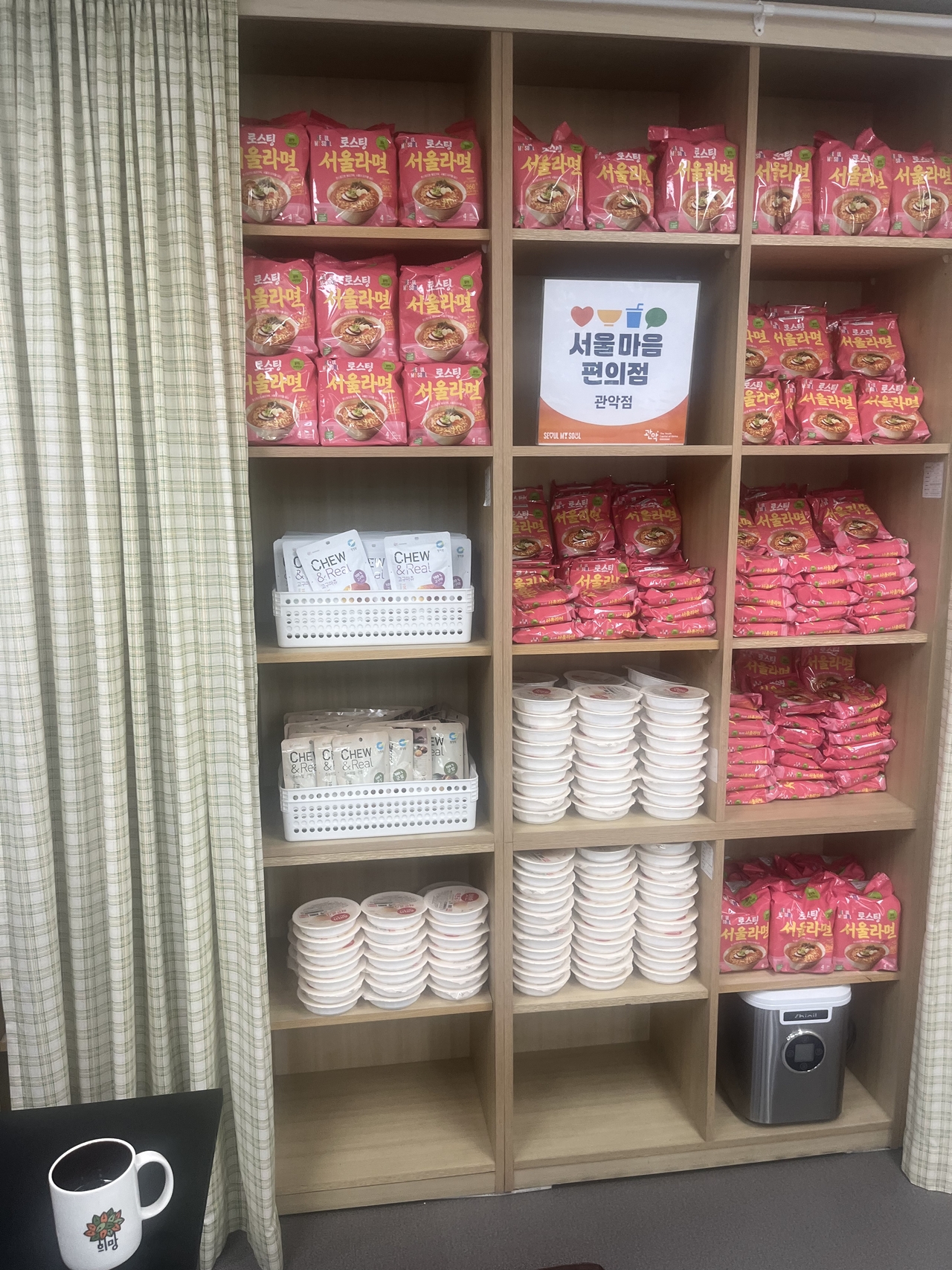 벽 한켠은 서울마음편의점의 시그니처 메뉴인 라면으로 가득했다. 싱가포르 매체 더 스트레이트 뉴스는 최근 마음편의점 관악점을 찾아 “한국인과 라면, 그리고 외로움은 어떤 관계냐”는 질문을 하기도 했다고 한다. 이곳의 라면은 방문객이 직접 라면조리기에서 조리를 해먹는 방식으로 운영되고 있었다. 햇반·김치·단무지도 구비됐고, 고구마 말랭이 같은 간식도 있었다. 모두 무료였다.