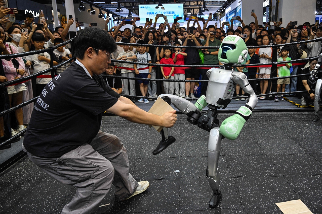 | 중국 상해에서 28일(현지시간) 열리고 있는 세계 인공지능 컨퍼런스 도중 로봇이 송판을 깨고 있다. [AFP] |