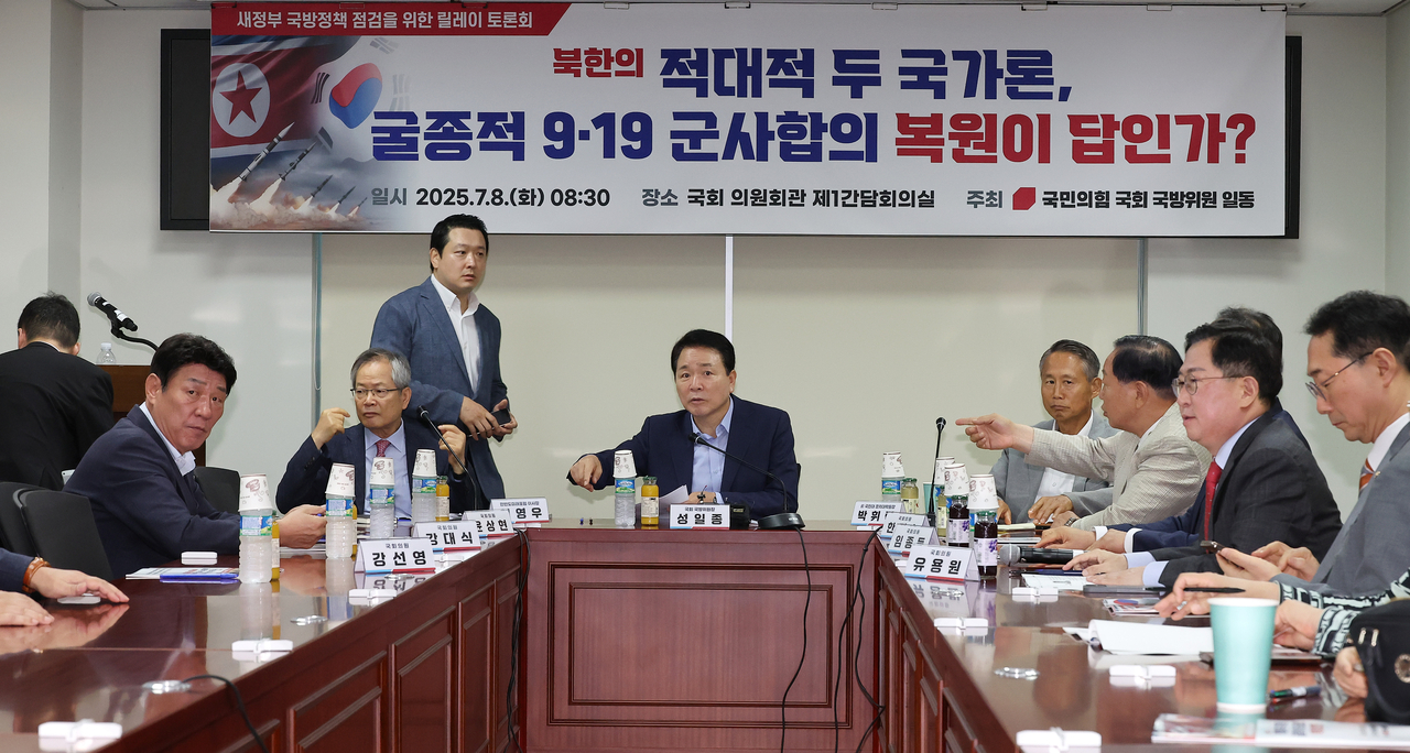 | 지난 8일 국회에서 국민의힘 국방위원들 주최로 열린 ‘북한의 적대적 두 국가론, 굴종적 9·19 군사합의 복원이 답인가?’ 토론회에서 성일종 의원(가운데)이 회의를 주재하고 있다. [연합] |
