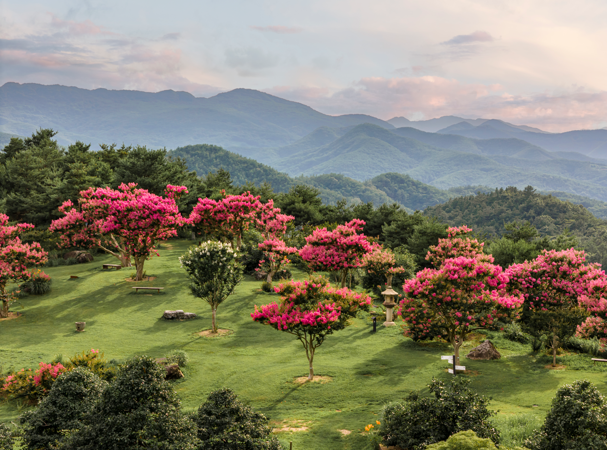 팔공산 지맥을 따라 조성된 약 10만 평 규모의 수목원 중 여름철 진분홍색으로 물드는 구역이 바로 ‘별유동천(別有洞天)’이다. 정원의 중심 수령 200년 이상 된 배롱나무들이 최근 꽃을 피웠다. 봄의 복숭아꽃 도화와 색깔이 닮아, 무릉의 ‘도원’을 연상케 한다.