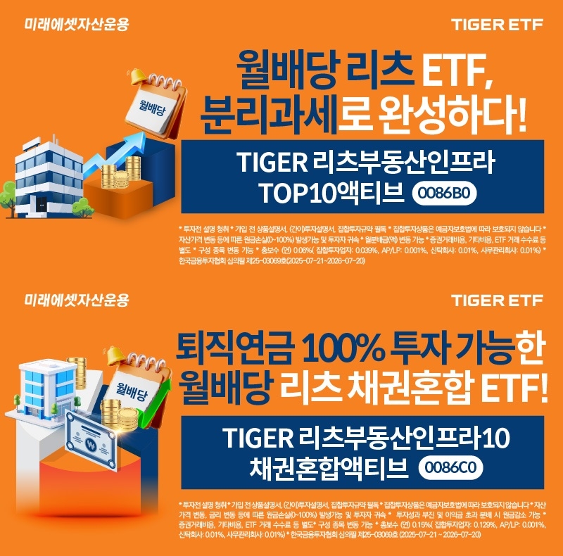 미래에셋자산운용은 한국거래소에 ‘TIGER 리츠부동산인프라TOP10액티브 상장지수펀드(ETF)’, ‘TIGER 리츠부동산인프라10채권혼합 액티브 ETF’ 2종을 신규 상장한다고 29일 밝혔다.