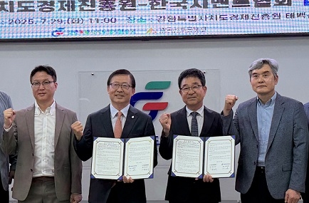 | 서동면 강원도경제진흥원 원장(왼쪽 두번째), 전근식 한국시멘트협회 회장(〃세번째)이 29일 강원 원주시 소재 진흥원에서 업무협약을 하고 있다. |