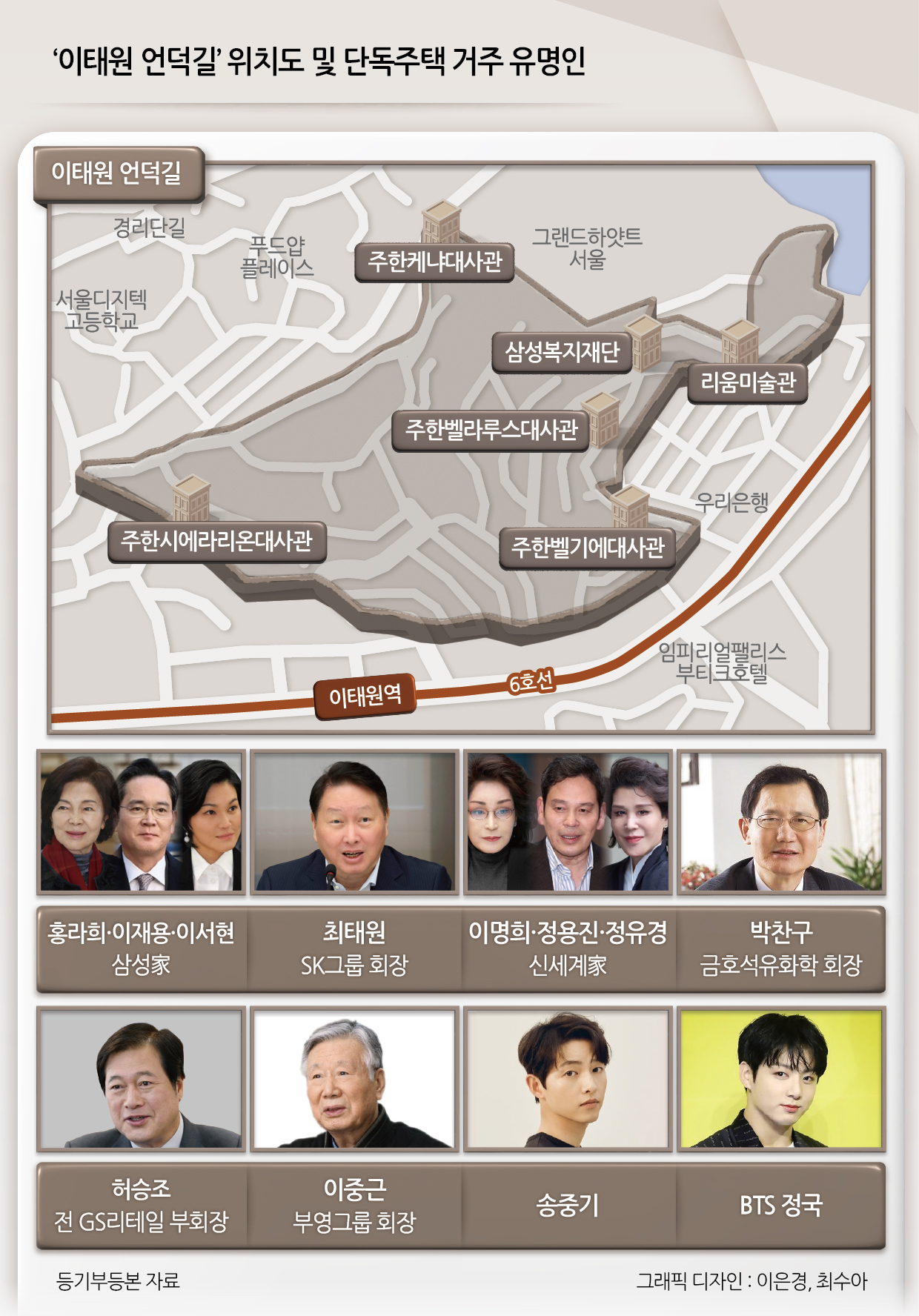 본래 각국 대사관이 많고 용산 미군기지와 가까워 외국계 고위 인사들이 모여살기 시작해 ‘외국인 주거지’로 인식됐던 이태원 언덕길 일대는 1990년대 후반~2000년대 중반 국내 재계 1~2세들이 터전을 마련하면서 국내 대표 부촌이라는 이미지를 쌓아나갔다.