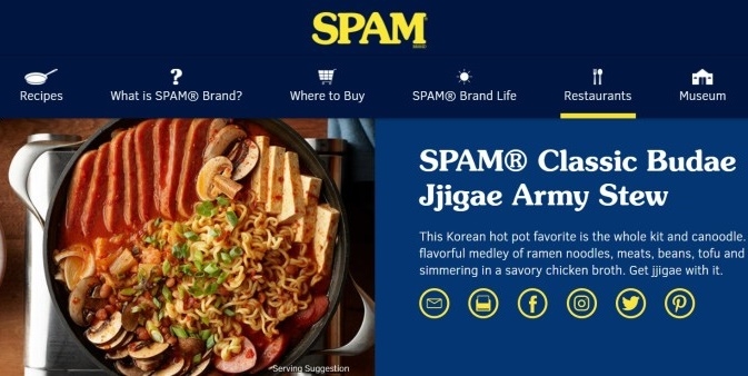 이러한 반응에 스팸의 본사 미국 호멜푸드(Hormel Foods)는 ‘코리안’을 홍보 전략으로 내세우고 있다. 홈페이지 등을 통해 김밥과 비빔밥, 부대찌개(Classic Budae Jjigae Army Stew) 레시피를 자세히 소개했다.