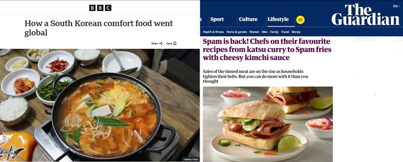 영국 매체 가디언은 이보다 앞서 ‘스팸이 돌아왔다(Spam is back!)’라는 기사(2022)를 보도했다. 미국 내 스팸 매출이 늘기 시작했다면서 ‘한국인의 스팸 사랑’을 집중 조명했다. 매체는 “한국에서 스팸은 오랫동안 사랑받는 음식”이라며 “명절 기간 한국의 마트는 스팸 선물 세트로 가득 차 있다”고 전했다. 이어 “한국에서는 아침 식사 때 달걀후라이와 함께 스팸을 먹기도 한다”며 스팸에 김치와 치즈를 곁들여 먹는 한국식 레시피도 소개했다.