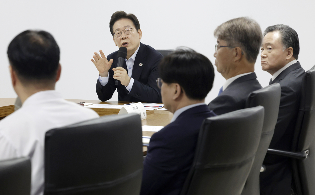 | 이재명 대통령이 지난 25일 경기 시흥시 SPC 삼립 시흥 공장에서 열린 산업재해 근절 현장 노사간담회에서 허영인 SPC그룹 회장 등 회사 임원들에게 질문하고 있다. [연합] |