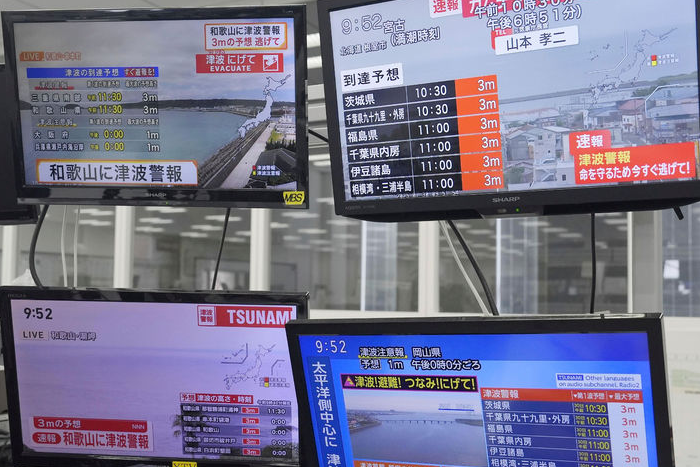 | 30일(현지 시간) 러시아 캄차카반도 인근 해상에서 강진이 발생해 일본 일부 지역에 쓰나미 경보가 발령된 가운데 오사카의 TV에서 쓰나미 경보 속보를 전하고 있다.[뉴시스] |