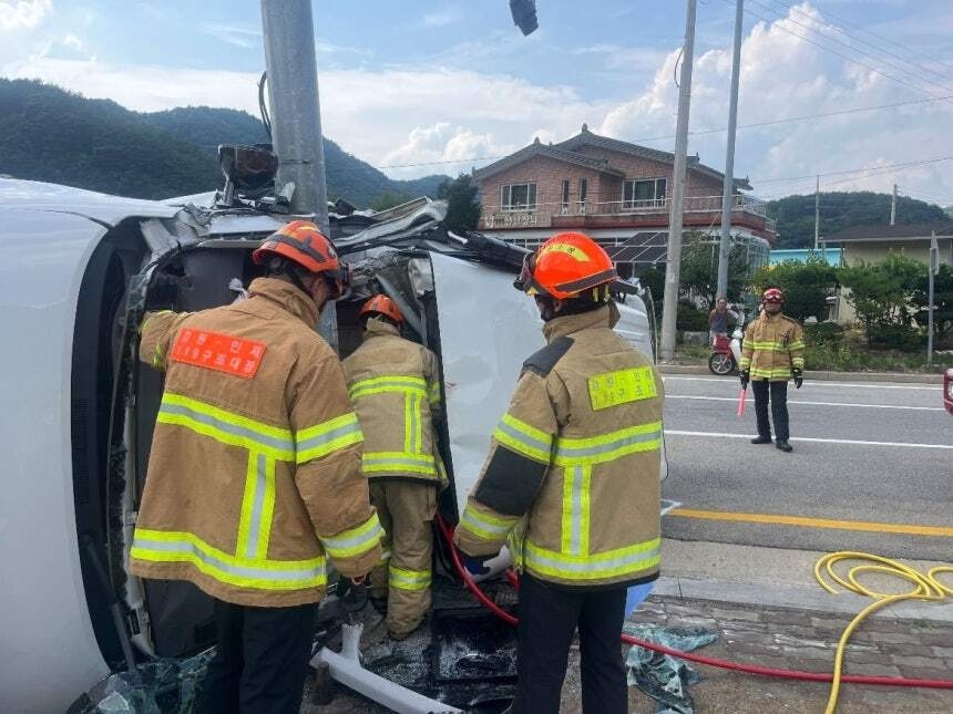 | 30일 오후 강원 인제군 북면 한계사거리에서 40대 아버지가 운전하던 스타리아 차량이 신호등 기둥을 들이받았다 [강원도소방본부 제공] |