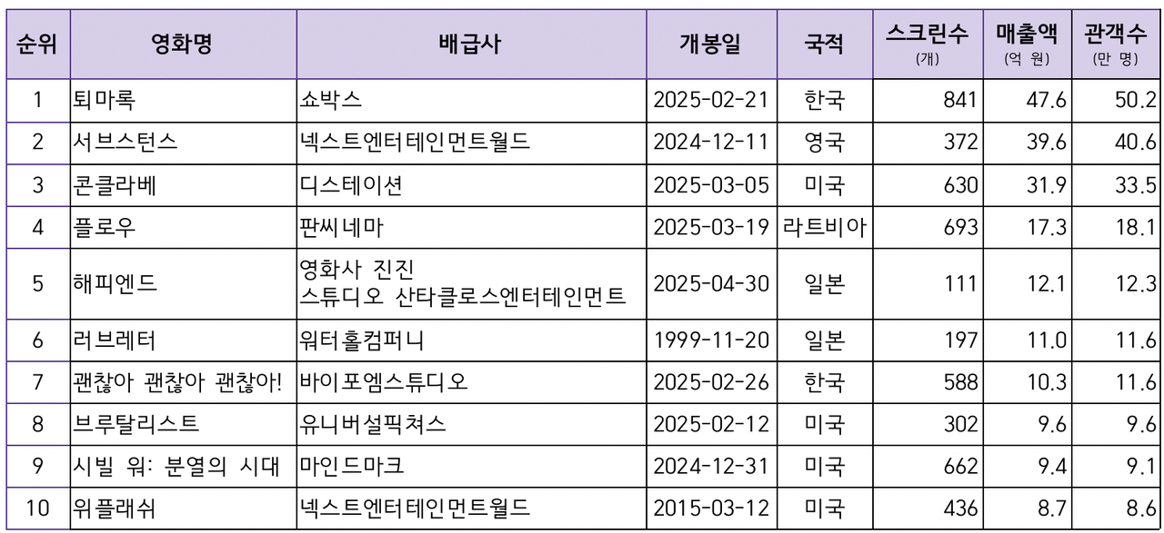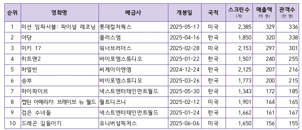 상반기 개봉 영화 흥행 1위에는 329억원의 매출을 올린 ‘미션 임파서블: 파이널 레코닝’(관객 수 336만)이 이름을 올렸다. ‘야당’(338만명)과 ‘미키17’(301만명)이 2,3위로 그 뒤를 이었다. 독립 ·예술영화에서는 국산 애니메이션 ‘퇴마록’이 47억5570만원(관객 수 50만1702명)의 매출로 상반기 독립· 예술영화 흥행 1위에 올랐다. 2위는 ‘서브스턴스’, 3위는 ‘콘클라베’ 였다.