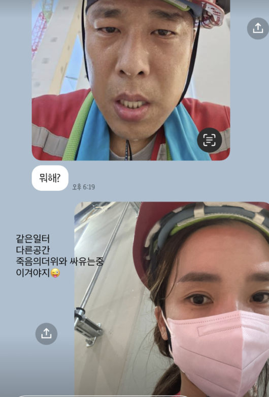 공개된 메시지에는 안전모를 눌러쓴 김동성이 땀에 젖은 얼굴로 “뭐해?”라고 물었고, 인민정은 같은 복장으로 작업 중인 자신의 모습을 보내며 서로의 근무 상황을 공유했다.