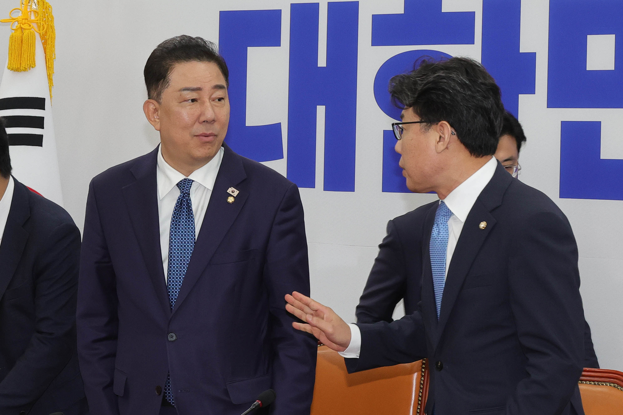 | 김병기 더불어민주당 당대표 직무대행 겸 원내대표가 31일 서울 여의도 국회에서 열린 정책조정회의에 참석하며 진성준 정책위의장과 대화하고 있다.이상섭 기자 |