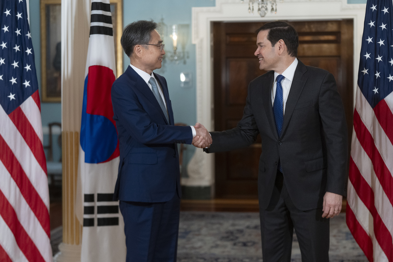 | 마코 루비오 미 국무장관(오른쪽)이 31일 워싱턴 국무부 조약실에서 조현 외교부 장관과 악수하고 있다. [AP] |