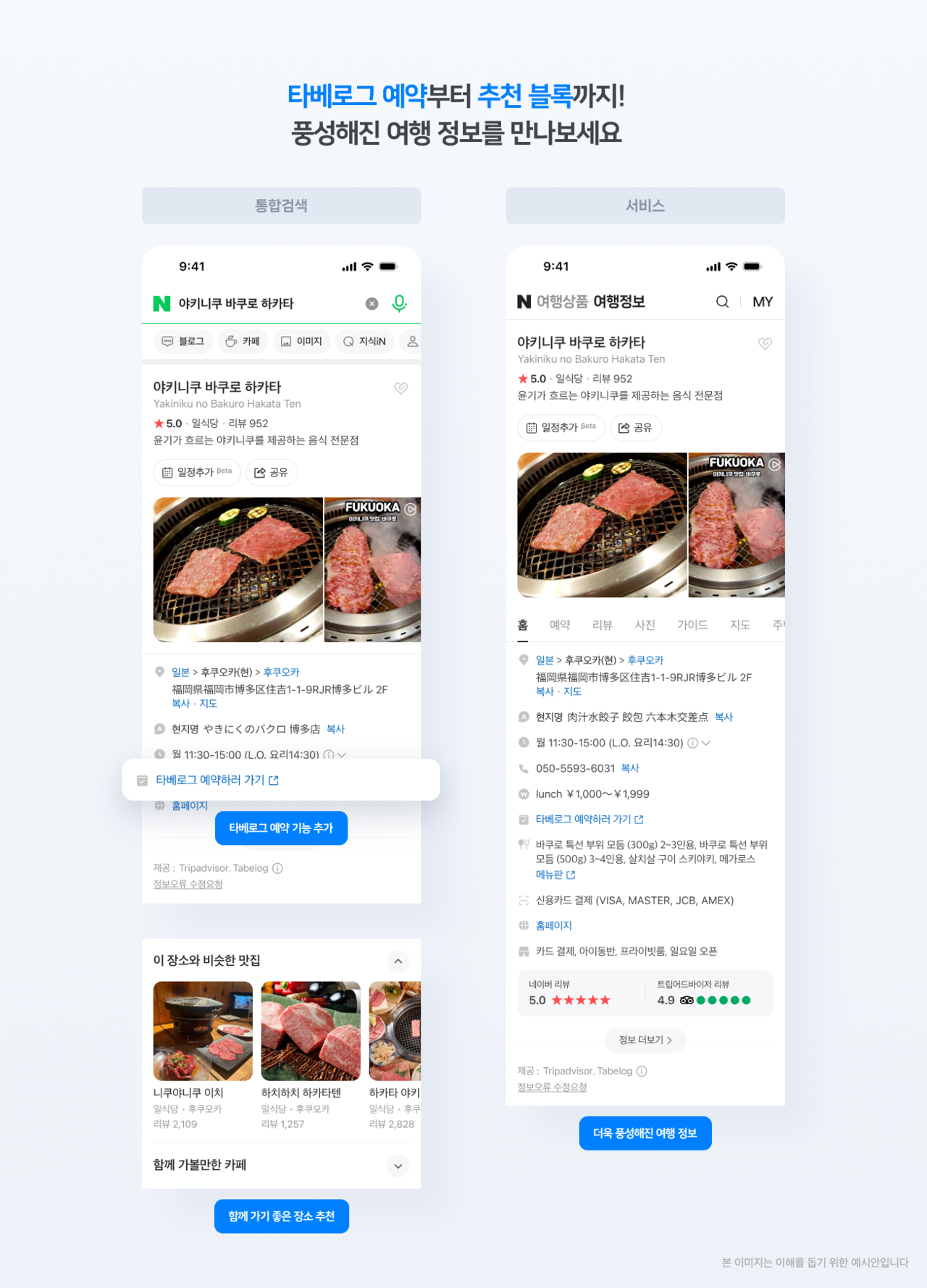 여기에 더해 타베로그로 예약이 가능한 음식점의 경우 ‘예약하러 가기’ 항목을 누르면 타베로그 예약 페이지로 이동해 이용자가 직접 예약할 수 있도록 지원한다. 연동 초기에는 도쿄, 오사카, 삿포로, 후쿠오카 등 주요 지역 내 선호도 높은 일부 음식점 중심으로 예약 링크 기능이 우선 제공된다. 이후 연말까지 예약 서비스 지원 범위를 순차 확대할 예정이다.