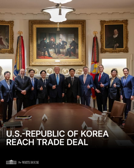 백악관은 이날 “트럼프 대통령이 또 하나의 역사적인 무역 합의를 한국에서 얻어 냈다”면서 트럼프 대통령과 협상단이 전날 백악관에서 찍은 단체 사진을 엑스(X·옛 트위터)에 올렸다.