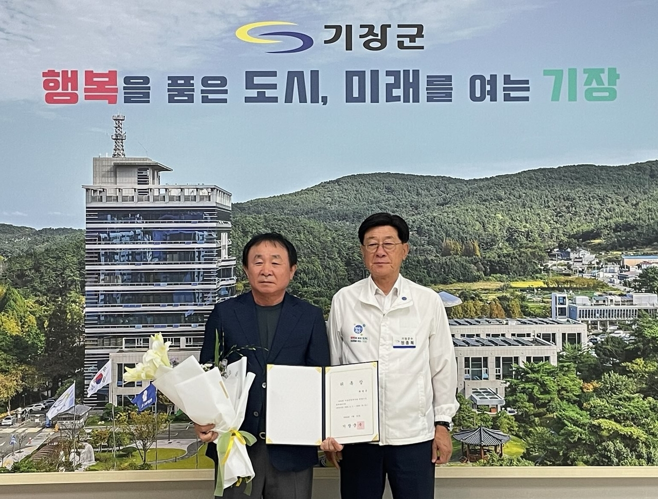 | 정종복 기장군수(사진 오른쪽)는 지난달 31일 군수실에서 최춘근 기장군민축구단 신임 단장에 위촉장을 수여했다. [기장군 제공] |