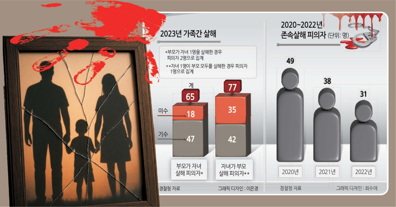 1일 경찰청에 따르면 존속살해 혐의를 받는 피의자 수는 ▷2020년 49명 ▷2021년 38명 ▷2022년 31명이다. 2023년부터는 통계가 세분화 됐는데 자녀가 부모를 살해한 경우가 77명, 반대로 부모가 자녀를 살해한 경우가 56명에 달한다.