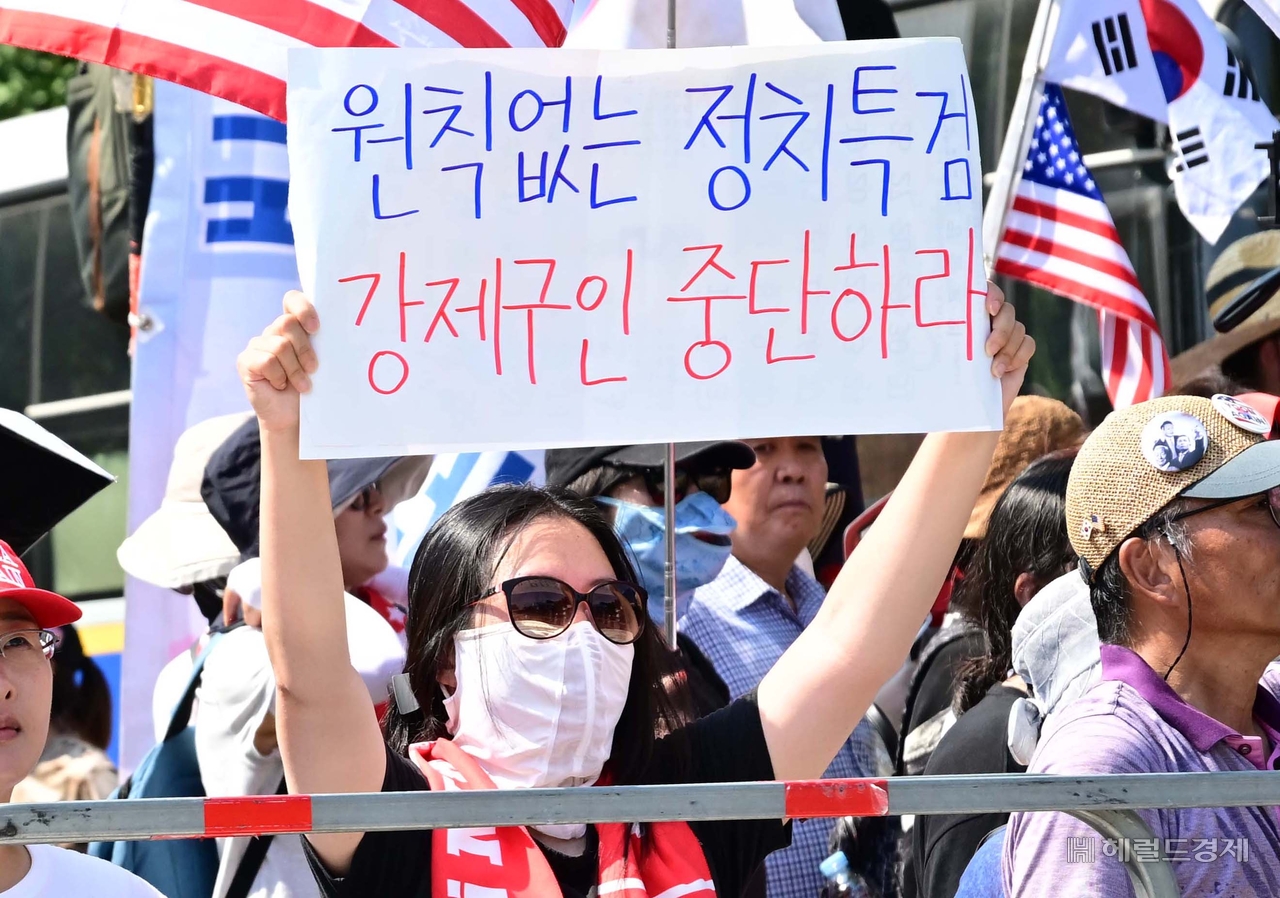 [헤럴드pic] ‘강제구인 중단하라…’ 글꼴 선택 본문 텍스트 크게본문 텍스트 작게 인쇄 [헤럴드경제=이상섭 기자] 김건희 여사 의혹들을 수사하는 민중기 특별검사팀이 윤석열 전 대통령에 대한 체포영장 집행에 나선 1일 오전 경기 의왕시 서울구치소에서 윤 전 대통령 지지자들이 시위하고 있다.