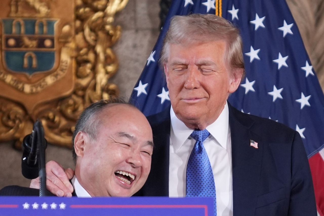 | 2024년 12월 16일 미국 플로리다 마러라고에서 열린 기자회견에 앞서 손정의 일본 소프트뱅크 회장이 도널드 트럼프 당선인 앞에서 미국에 1000억 달러를 투자하겠다고 밝혔다. 트럼프 당선인은 “2000억 달러를 해줄 수 있느냐”고 즉석에서 물었고 손 회장은 “노력하겠다”고 했다. [AP] |