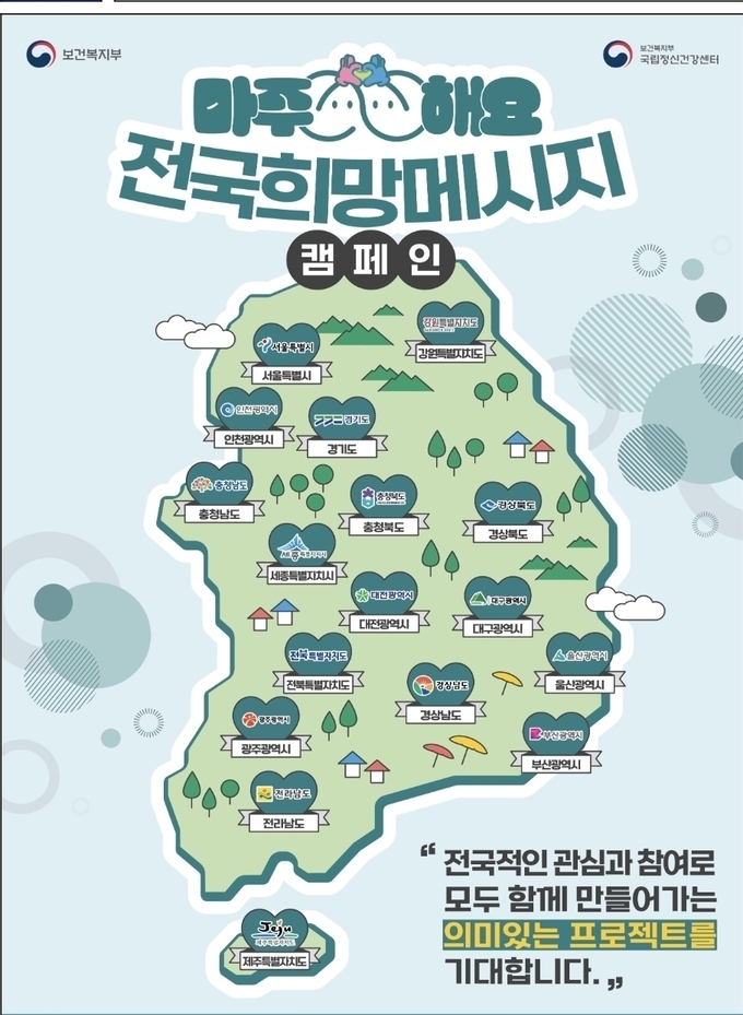 [헤럴드경제=이태형 기자]보건복지부 국립정신건강센터는 전국 17개 시도, 정신건강복지센터와 4일부터 14일까지 ‘마주해요! 전국 희망메시지 캠페인’을 추진한다고 3일 밝혔다.