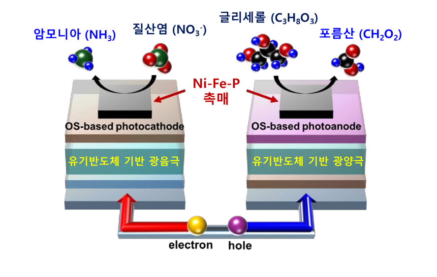 연구팀은 유기반도체 기반의 광전극*과 니켈-철-인(Ni-Fe-P) 촉매를 결합한 광전기화학 시스템을 개발, 바이오디젤 산업에서 발생하는 주요 폐기물인 글리세롤과 질산염(NO₃)을 각각 포름산(개미산)과 암모니아로 동시에 전환하는 데 성공했다.