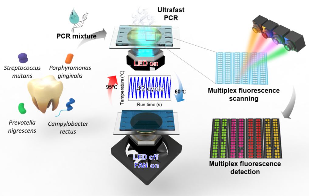 연구팀은 이 기술을 활용해 치주질환의 주요 원인균인 충치균 등 4종의 세균 유전자를 대상으로 검증실험을 진행하여 14분 만에 유전자 증폭을 완료, 이후 9분 내에 고해상도 형광 스캔을 통해 유전자 존재 여부까지 확인할 수 있었다.
