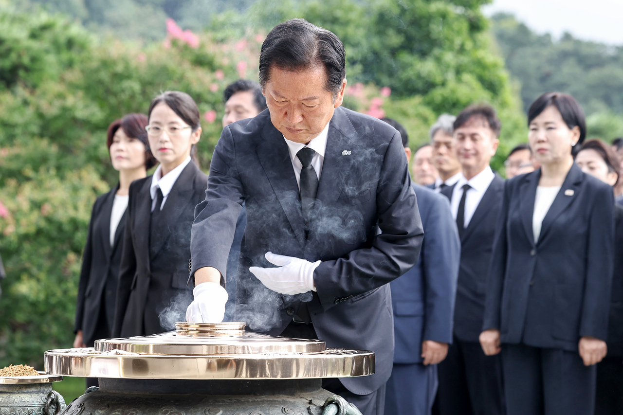 | 정청래 더불어민주당 대표가 4일 오전 서울 동작구 현충원을 찾아 현충탑에 분향하고 있다. 이상섭 기자 |