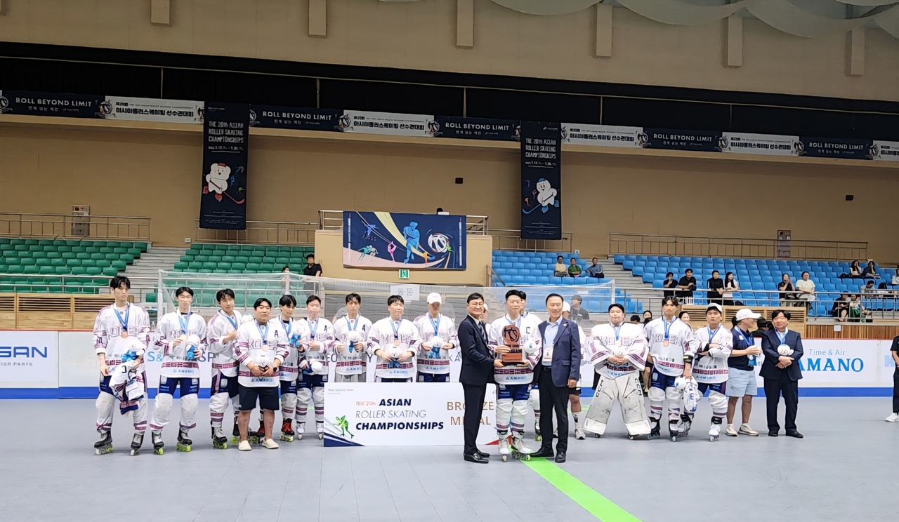 | 김경석(앞줄 왼쪽) 대한롤러스포츠연맹 회장이 제천에서 열린 ‘제20회 아시아롤러스케이팅선수권대회’에서 우수한 성적을 낸 선수에게 상을 수여하고 있다. <사진=대한롤러스포츠연맹> |