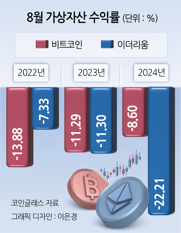 실제 8월 약세장은 최근 3년간 반복됐다. 비트코인과 이더리움은 2022년(-13.88%-7.33%), 2023년(-11.29%-11.30%), 2024년(8.6%-22.21%) 나란히 손실을 기록했다. 평균 수익률도 하위권에 머무른다. 비트코인은 과거(2013~2024년) 8월 평균 수익률 1.75%를 기록했다. 이는 9월(-3.77%), 6월(-0.36%) 평균에 이어 세번째로 낮다. 이더리움의 역대(2016~204년) 8월 평균 수익률은 6.13%로 ▷6월(-7.44%) ▷9월(-6.42%) ▷10월(-4.77%) 다음 하위다.