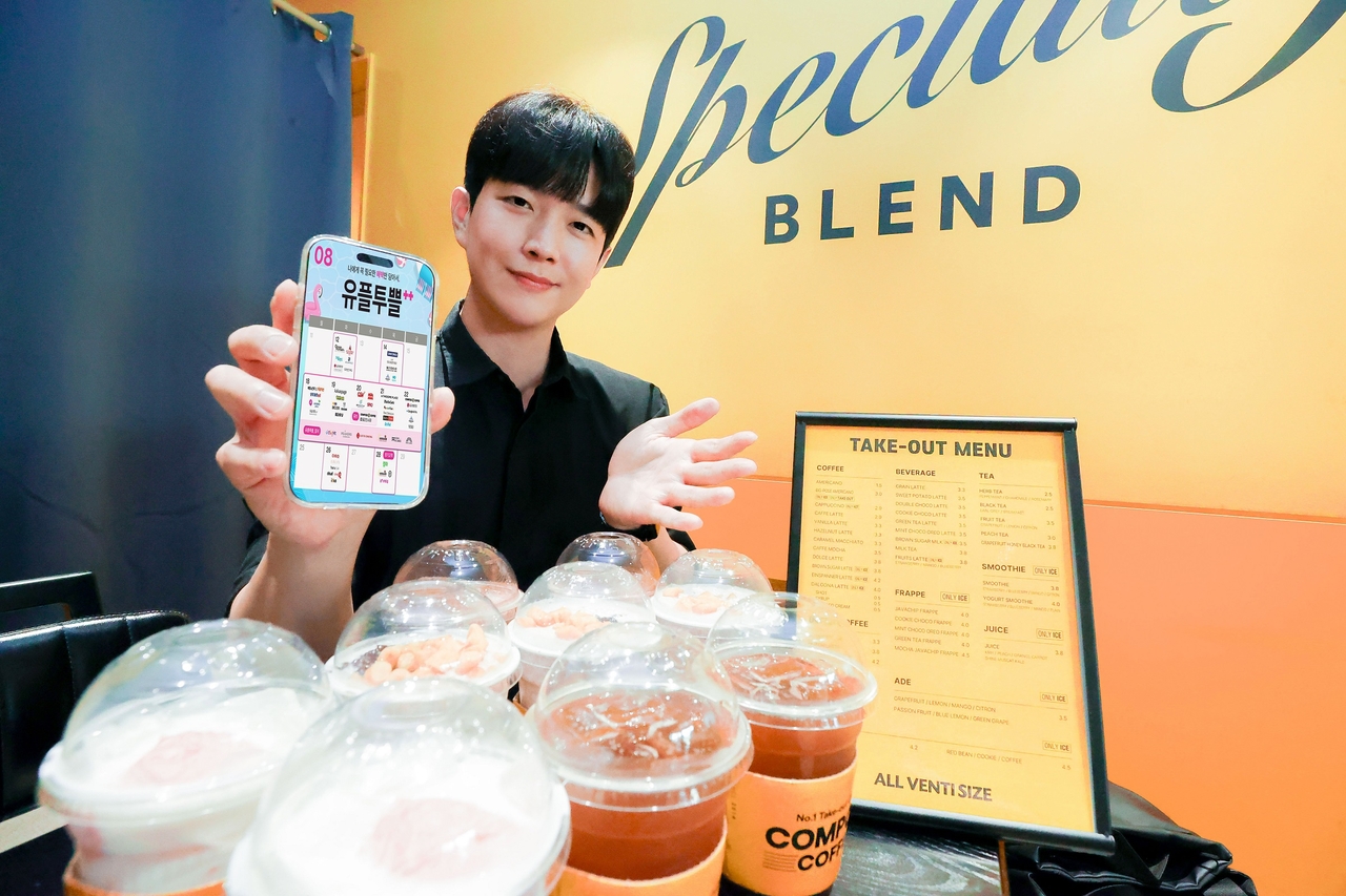 유플투쁠 인기 혜택인 컴포즈커피 매장에서 LG유플러스 직원이 8월 혜택을 소개하는 모습. [LG유플러스 제공]
