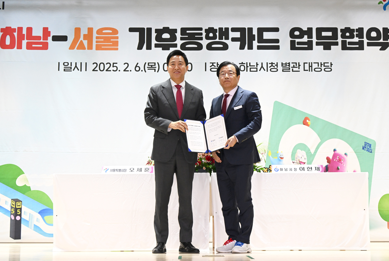 | 오세훈 서울시장과 이현재 하남시장이 지난 2월 6일 기후동행카드 업무 협약식을 맺었다. [서울시 제공] |